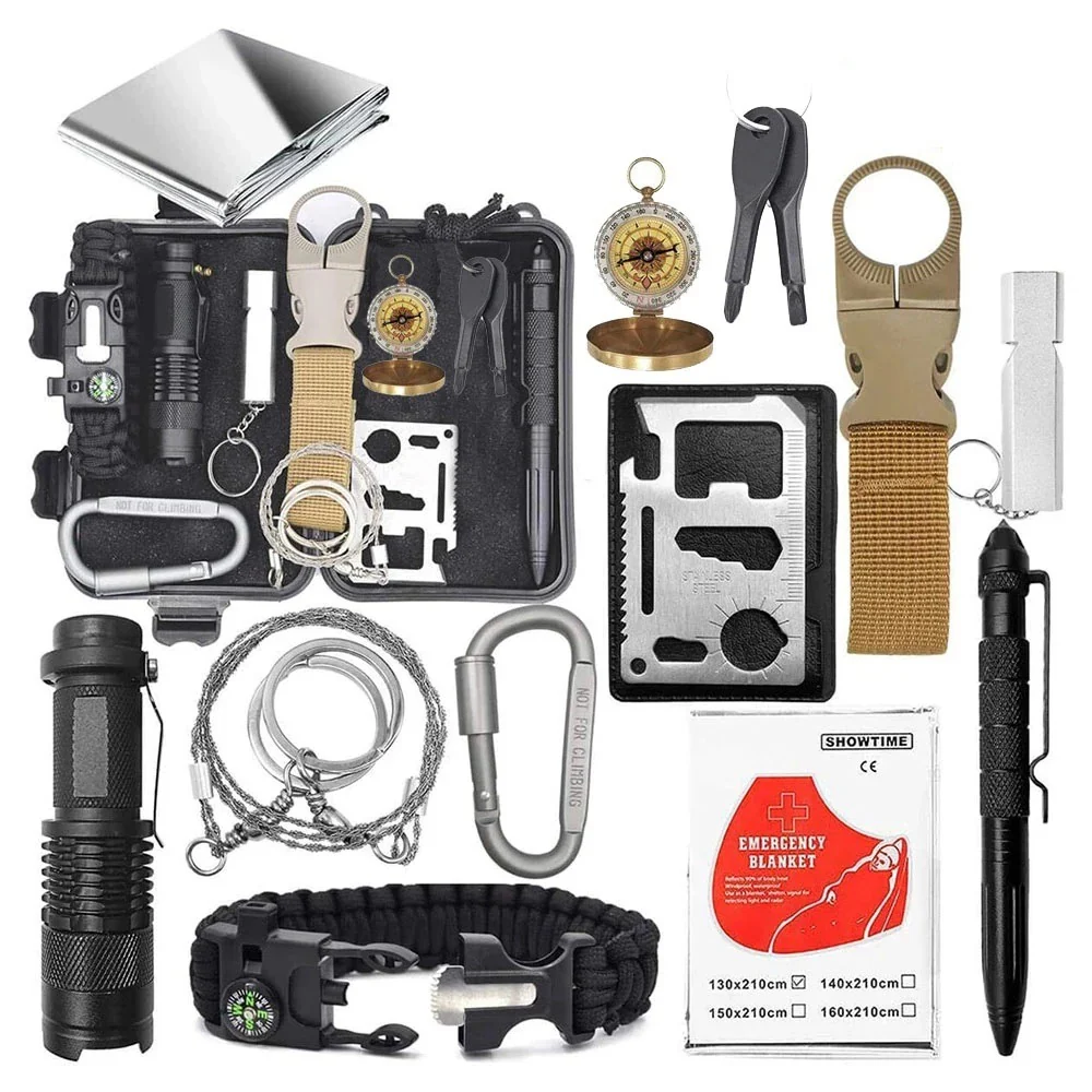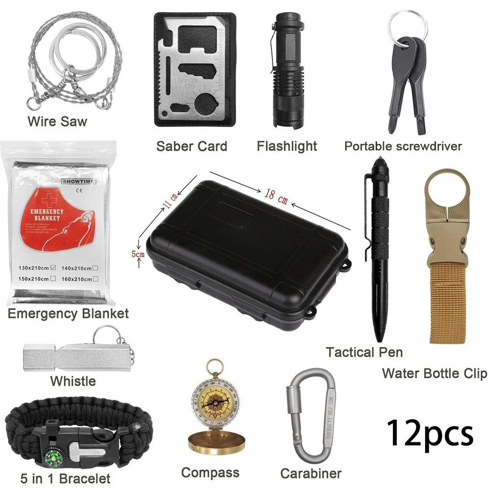 Deze survivalkit heeft alles wat u nodig heeft om te survivallen. De set bestaat namelijk uit 12 tools die u zeker van pas kunnen komen als u eropuit gaat. De set bestaat uit de volgende gereedschappen: een pen/veiligheidshamer, paracord armband met kompas, karabijnhaak, zaklamp, een clip voor aan uw riem, multifunctioneel zaagje, fluitje, reddingsdeken, draadzaag, kompas en een minischroevendraaier met sleutelhanger. Al deze producten worden geleverd in een stevig opbergdoosje van kunststof. U bent met deze set voorbereid op elke situatie die voor kan komen tijdens het survivallen. Alle gereedschappen zijn gemaakt van hoogwaardige materialen, zoals sterk kunststof en roestvrij staal.