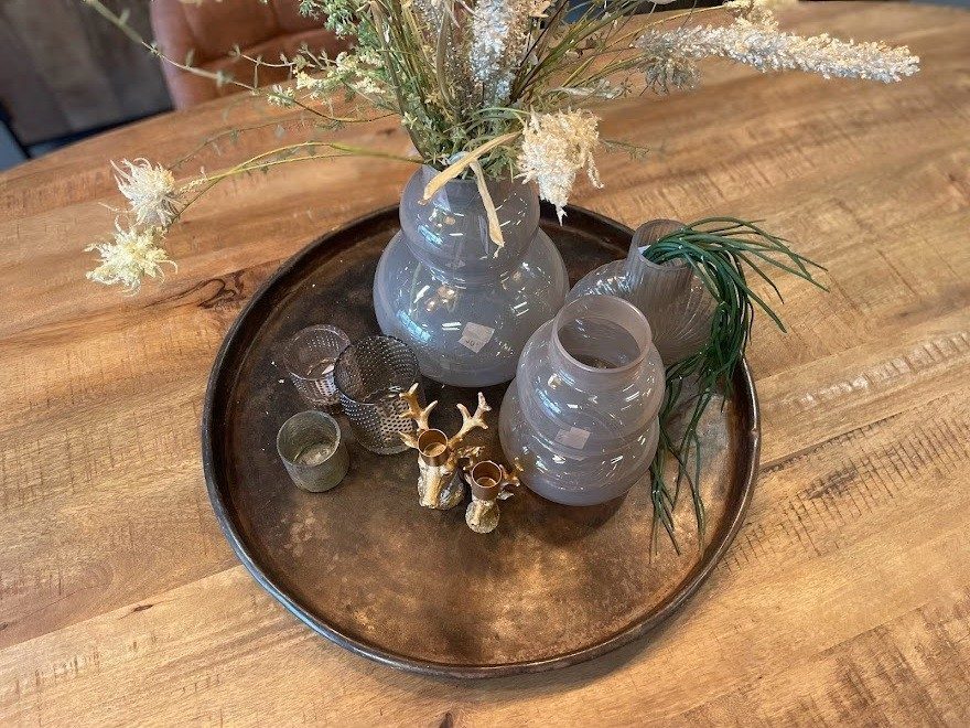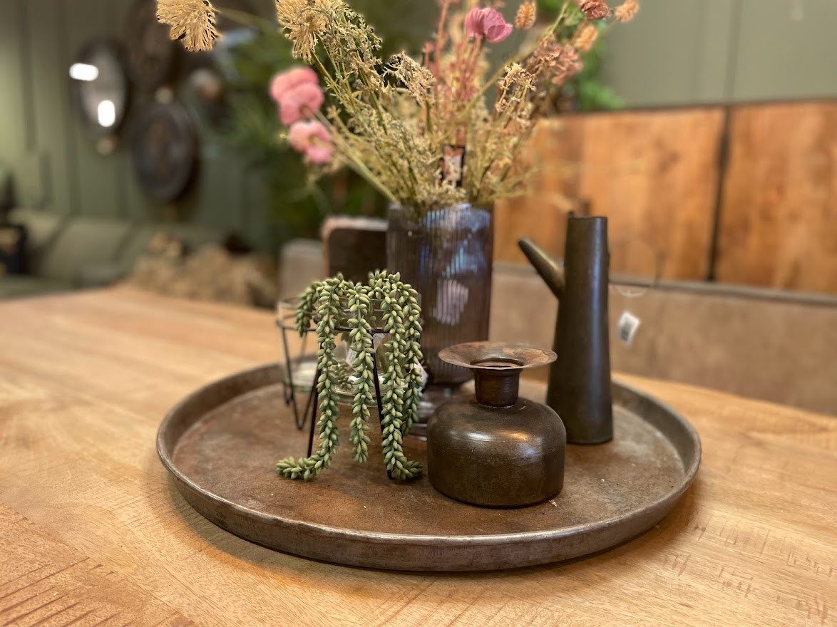 Dit antieke dienblad is gemaakt van oud metaal. Deze wordt geproduceerd in India en heeft daarom altijd een bijzondere en unieke uitstraling. Kortom, er nooit één gelijk!