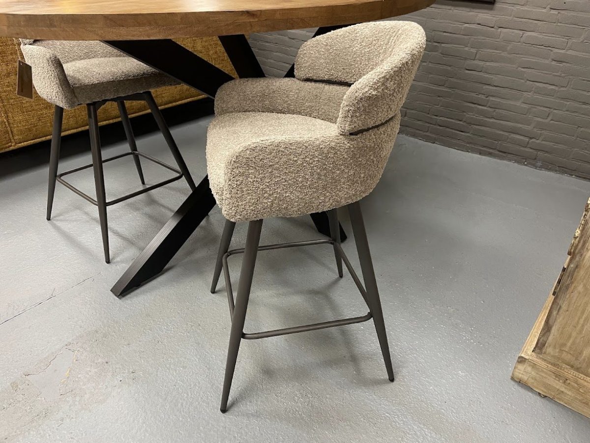 Barstoel Cassie is een stijlvol en modern model met een mooie ronde vorm. Deze barstoel krijgt een speelse uitstraling door de subtiele ronde belijning. Bekleed met een sterke Bouclé stoffering in de sfeervolle kleur Zand. Tevens is barstoel Cassie voorzien van een zwart metalen draaiframe.