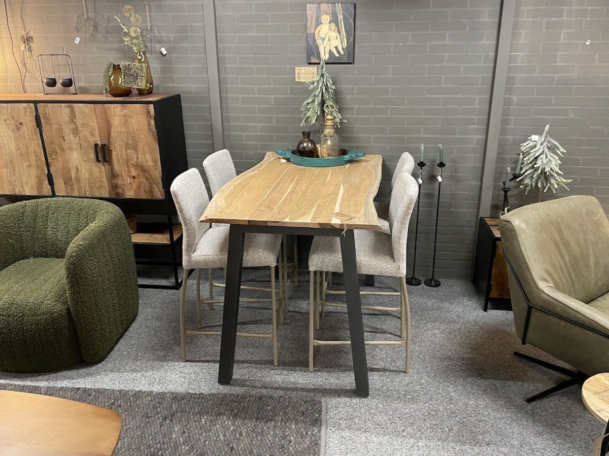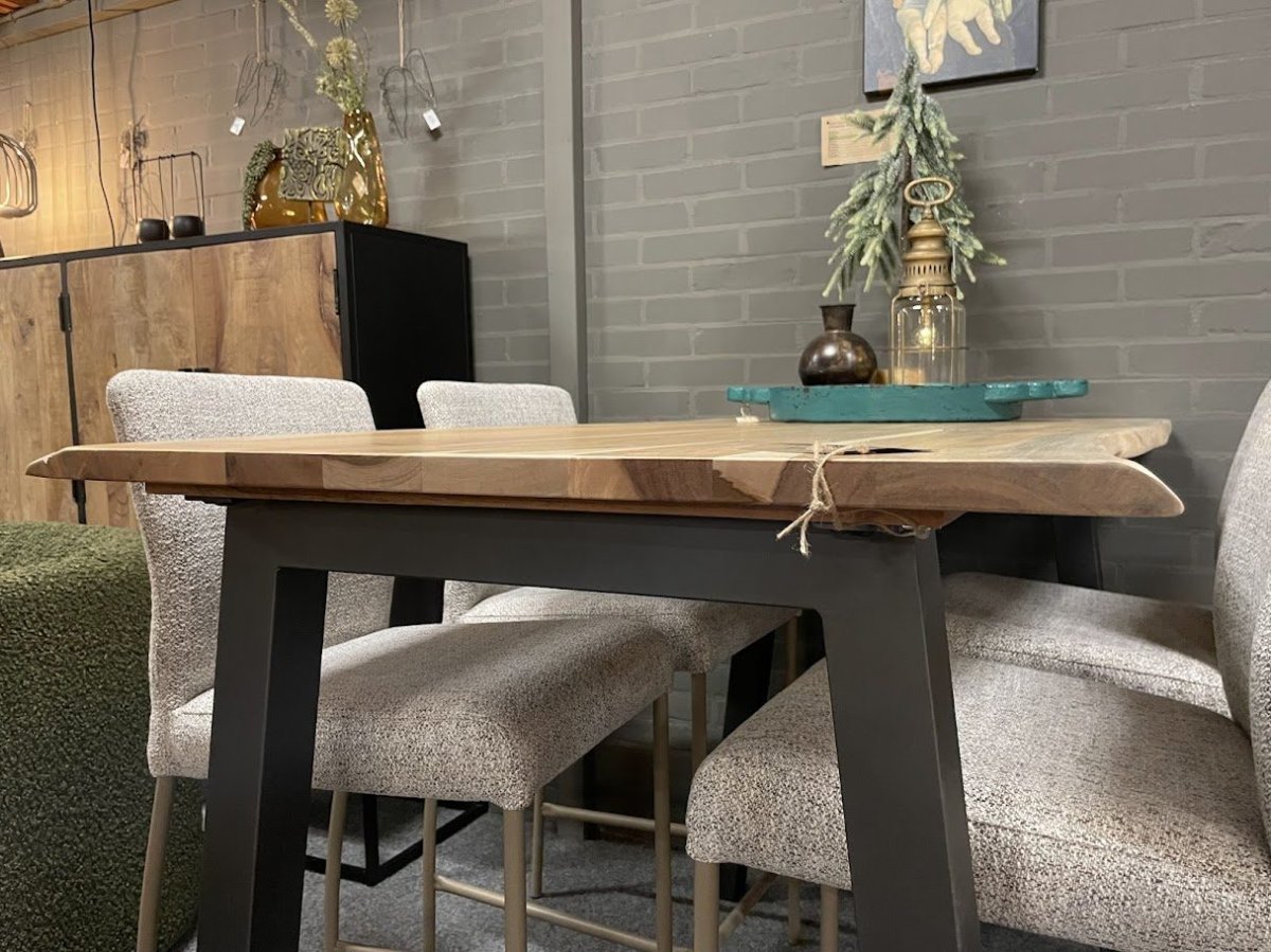 Bartafel Trapezium is 147 cm lang en ongeveer 80 cm breed, met een variatie van circa 10 cm door de natuurlijke vorm van het blad. Het bovenblad is gemaakt van 25 mm dik acaciahout en afgewerkt met een matte transparante lak die beschermt tegen vocht en vuil. Het grijs gepoedercoate U-frame van staal zorgt voor een stevige basis. De combinatie van materialen geeft de tafel een stoer en eigentijds karakter.