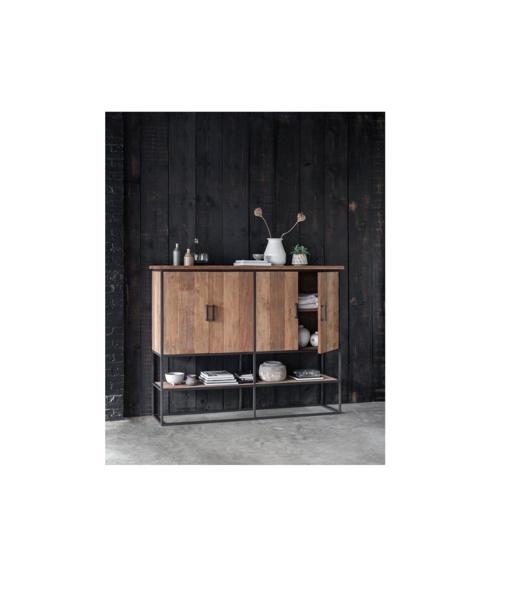 Bergkast Beam is gemaakt van teakhout en is afgewerkt met een metalen frame. De bergkast Large heeft een afmeting van 140x180x40 cm en heeft 4 deuren en een open vak.