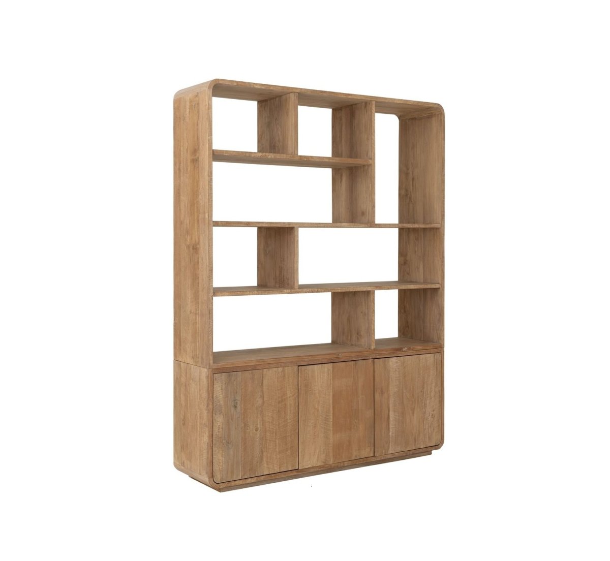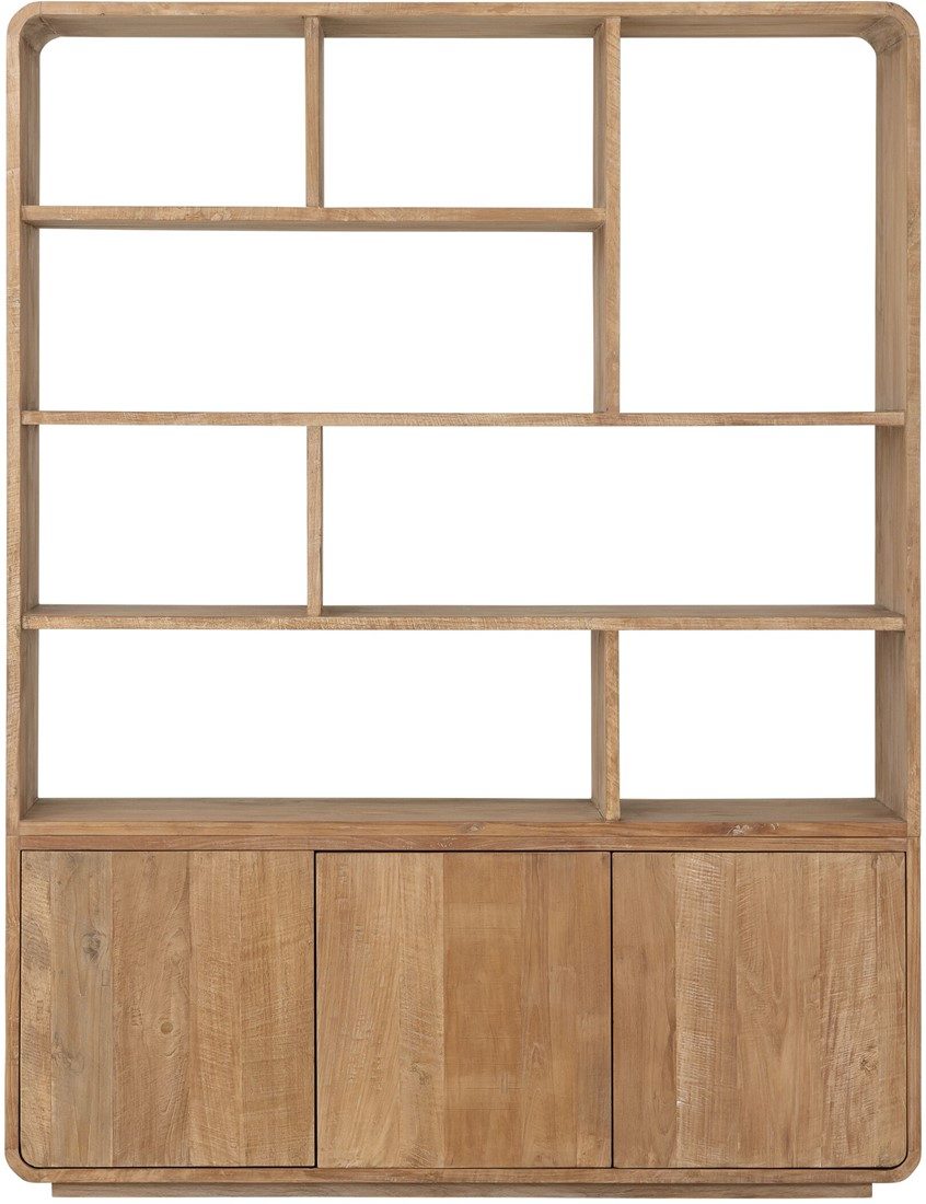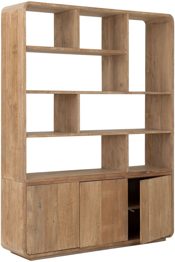 Boekenkast Nova Large is gemaakt van gerecycled teakhout. Boekenkast Nova heeft 8 open vakken en 3 push to open deuren aan de onderzijde. Mooie details zijn de afgeronde hoeken .