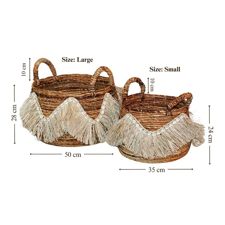 Decoratieve Opbergmanden Set van 2 – Handgevlochten Bananenstam / Bananenvezel Mand met Schelpen & Raffia – Boho Stijl – Met Handvatten – 52x52x35cm