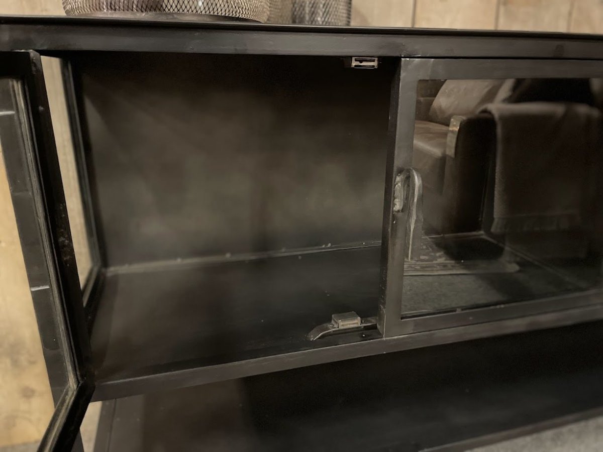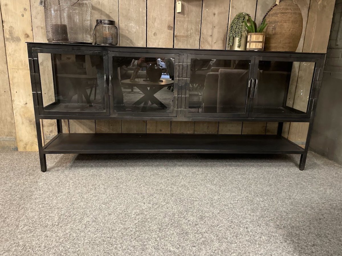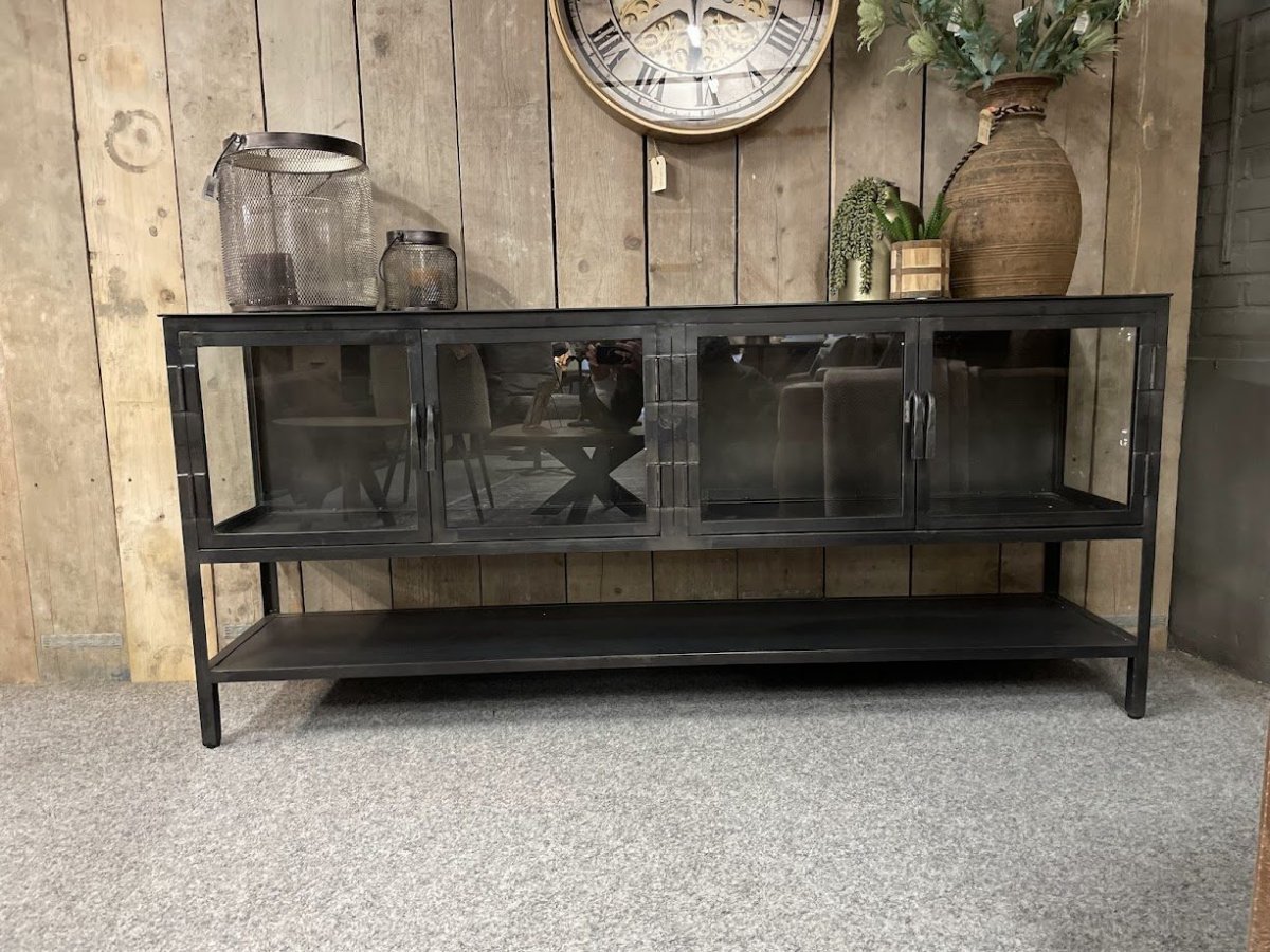 Dressoir Night is gemaakt van metaal met een gunmetal uitstraling. Dit dressoir is voorzien van4 glazen deurtjes waardoor er voldoende ruimte is om je spulletjes in op te bergen of je mooiste items in te decoreren. Het onderste deel bevat een open vak waardoor deze een luchtige uitstraling krijgt.