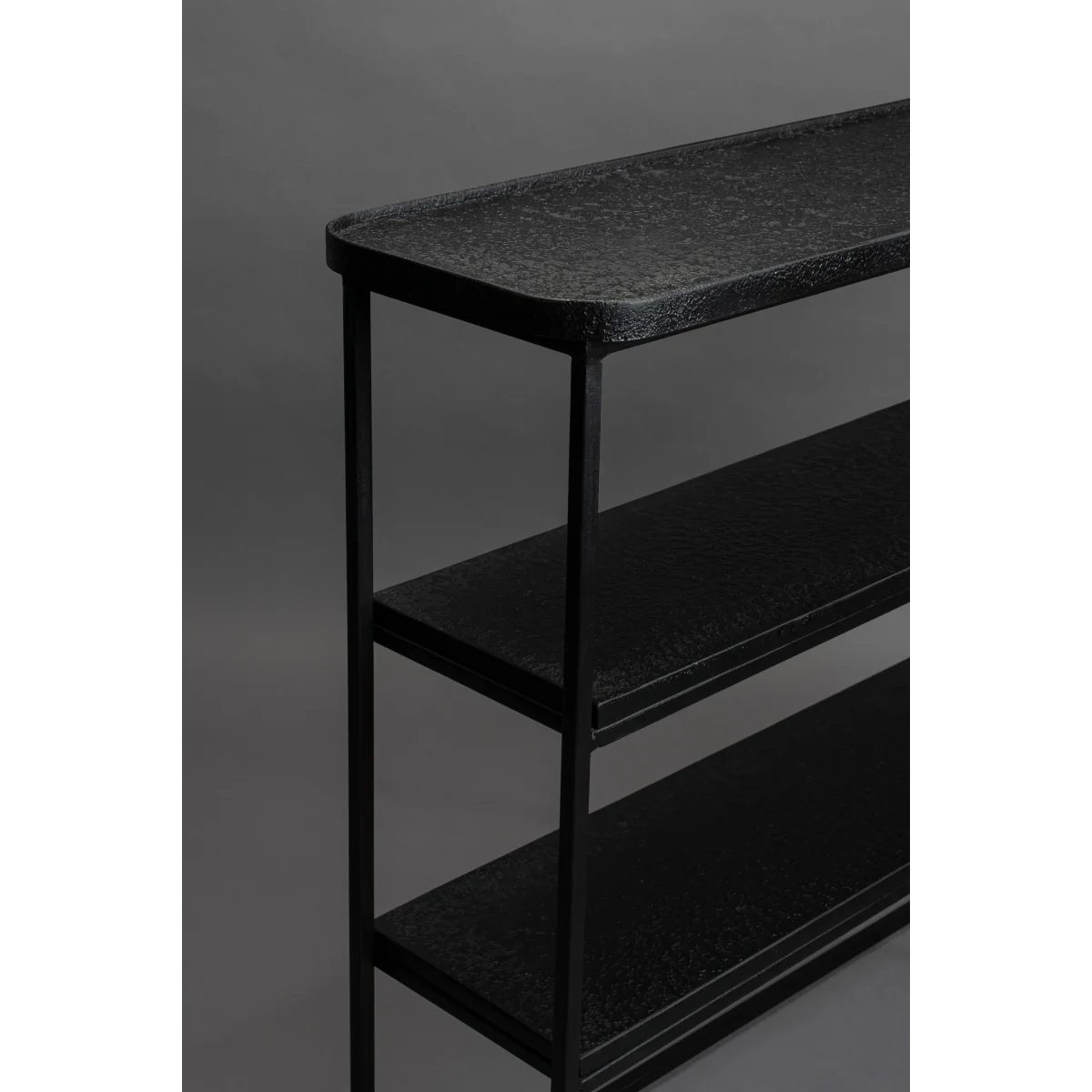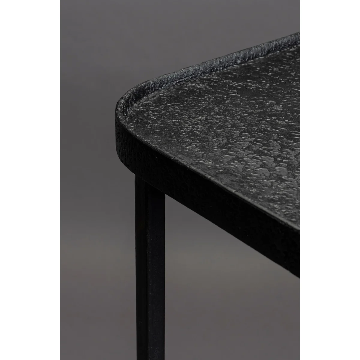 Deze zwart metalen consoletafel, Winston van Dutchbone is een echte blikvanger. Met zijn ruw metalen oppervlakte heeft hij een echt industrieel tintje. Dat contrasteert mooi met dat ranke onderstel. Deze side table is gemaakt met een de bijzondere methode Liquid Metal. Daarbij wordt metaal gesmolten over een houten basis gegoten. De dunne metalen coating heeft een mooie structuur en is ook nog ijzersterk.