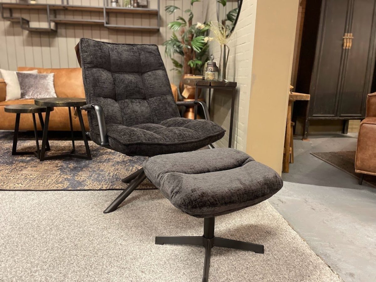 Deze set bestaat uit fauteuil Sandra bouclé antraciet en een bouclé voetenbankje.