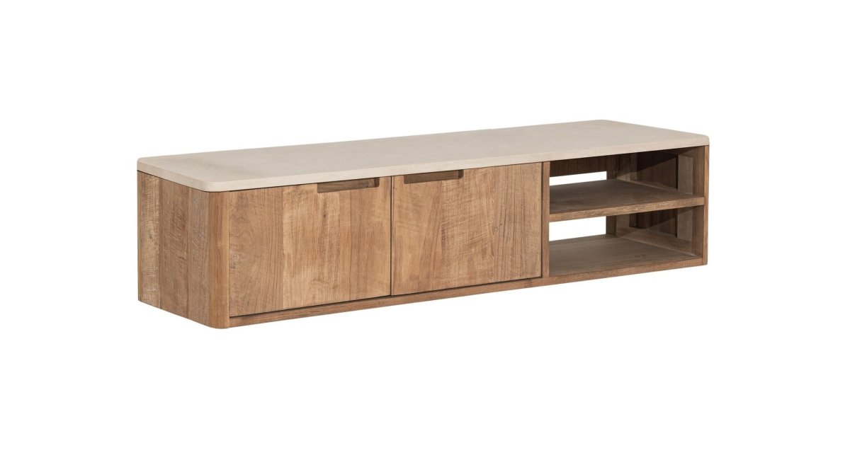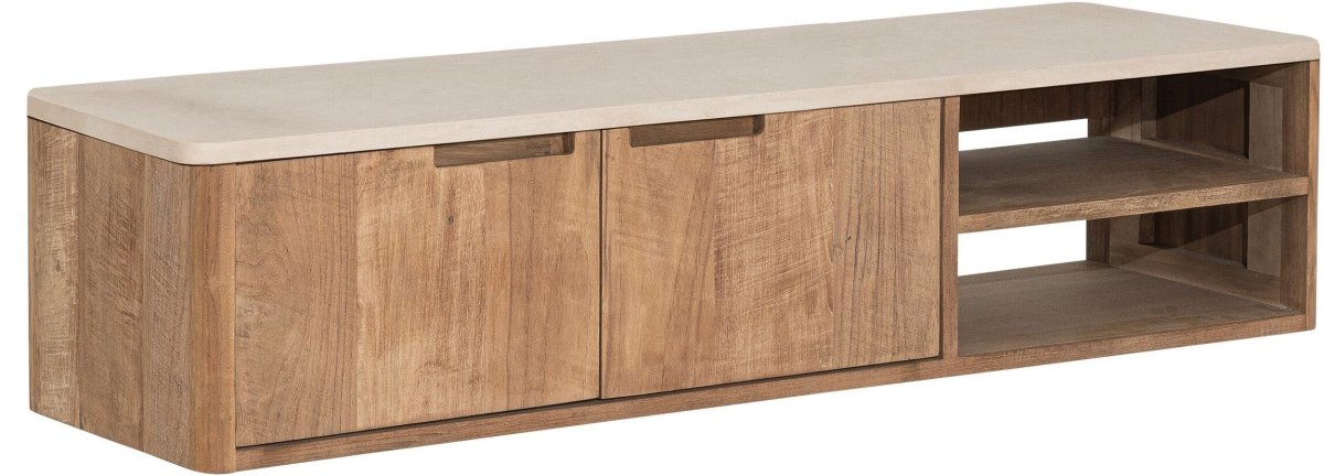 Hangend tv-meubel Bliss No2 is gemaakt van teakhout met een mortexblad, en heeft in de maat 130cm 2 deuren en 2 open vakken. Verkrijgbaar in volledig teakhout of met een blad van mortex, de combinatie van teak en het mortex in de kleur sand creëert een ton-sur-ton kleurenpalet.