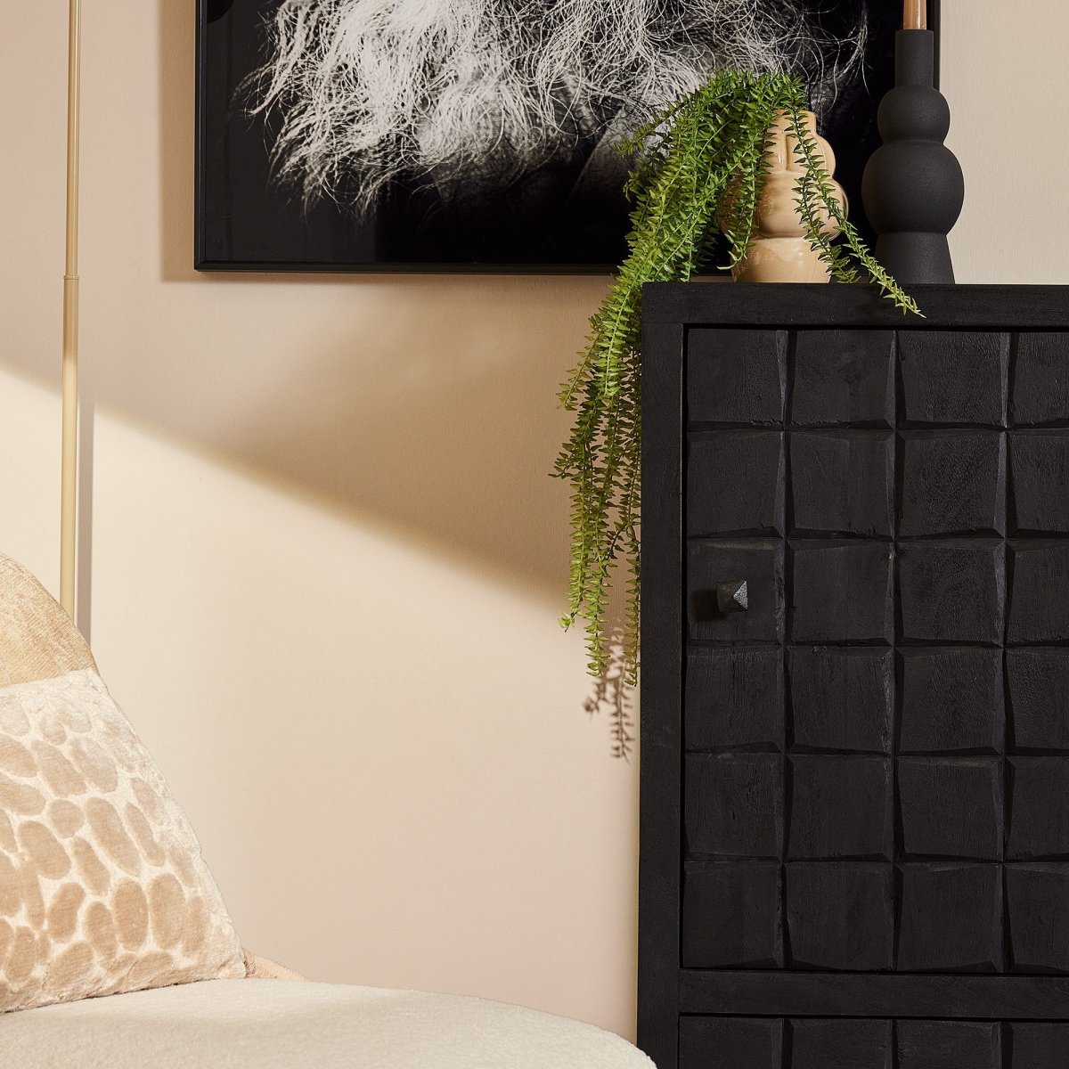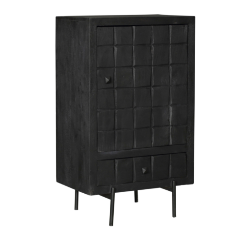Kabinet kast Brandy Black van Starfurn is uitgevoerd in mangohout met een metalen poot. Dit model is voorzien van één deur en één lade. De kast is ingelegd met verschillende stroken zwart gelakt hout. Het ingesneden blokken patroon geeft de woonserie Brandy Black van Starfurn een unieke uitstraling.