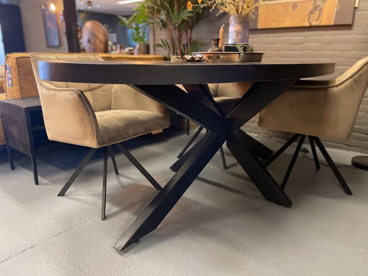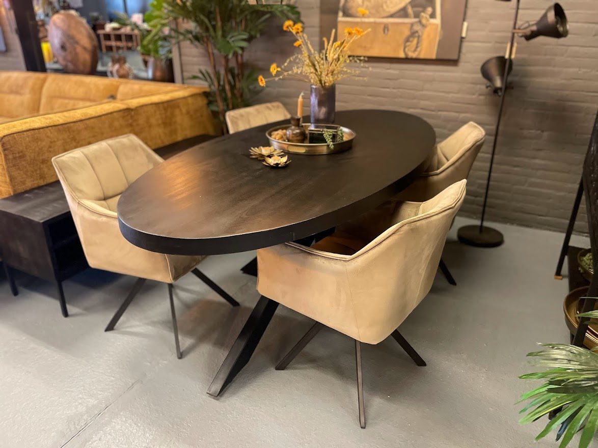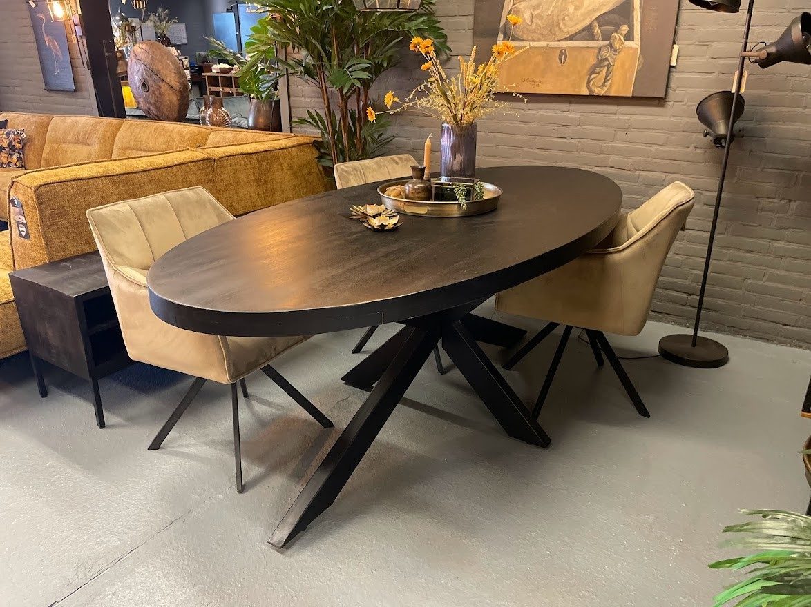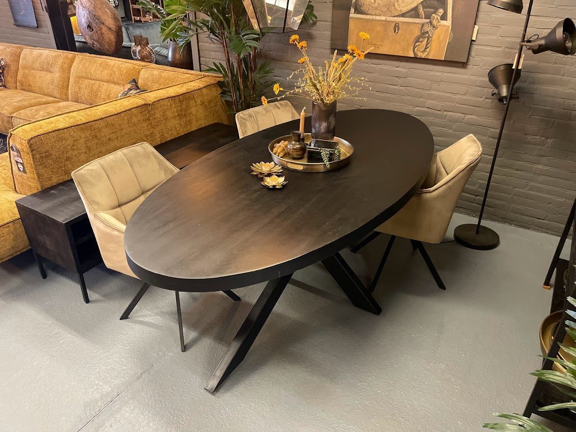 Ovale eettafel 210×100 Night is een stoere tafel op een zwart metalen spin poot. Het blad is gemaakt van dik mangohout dat mooi glad en zwart is afgewerkt. Hierdoor heeft de hele tafel een industriële en stoere uitstraling.