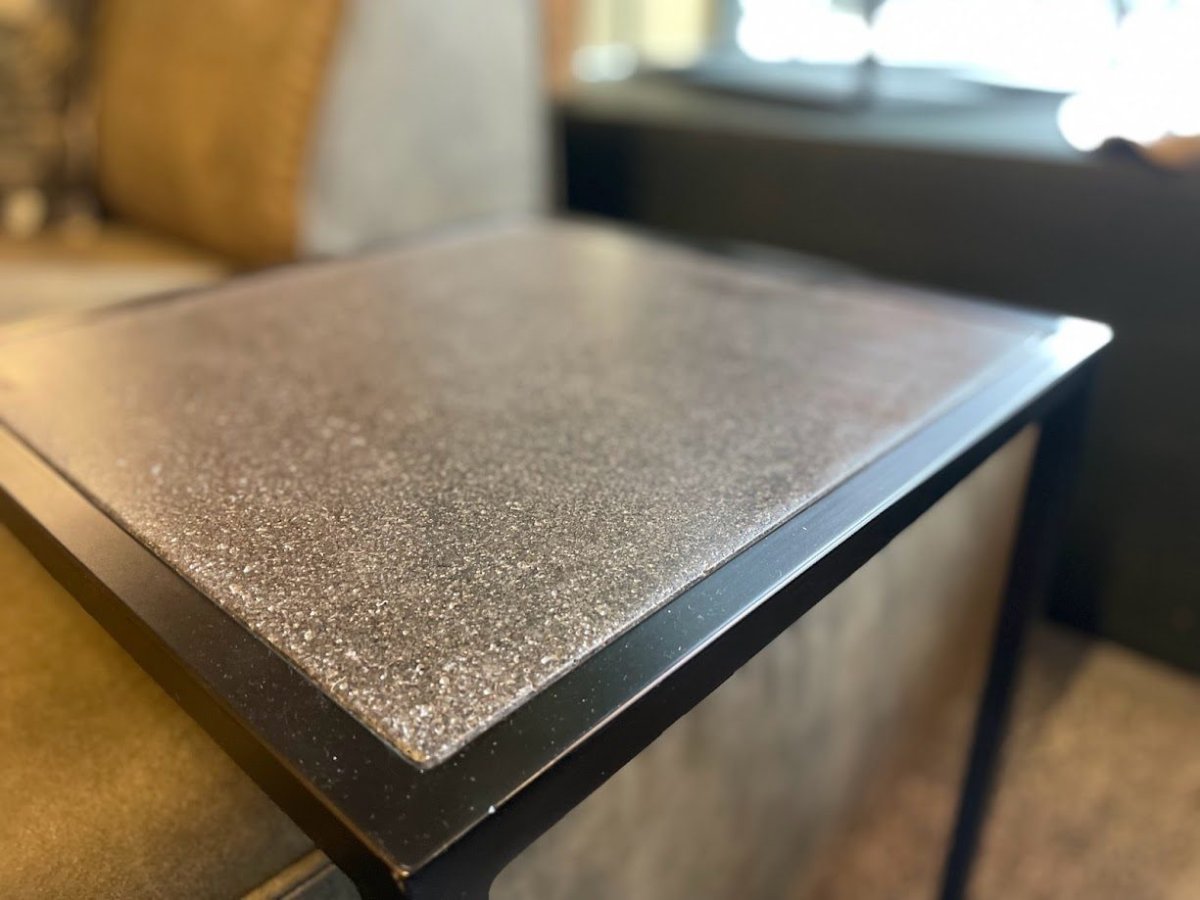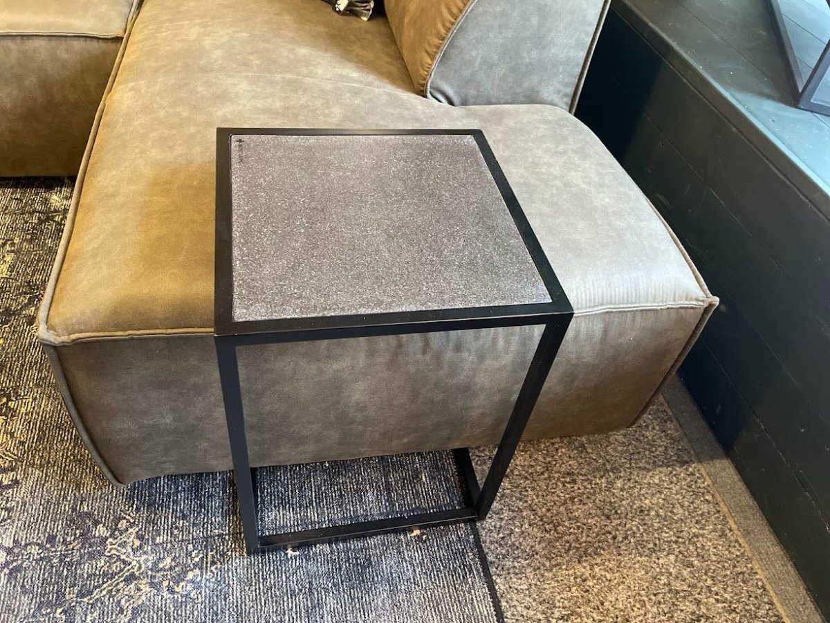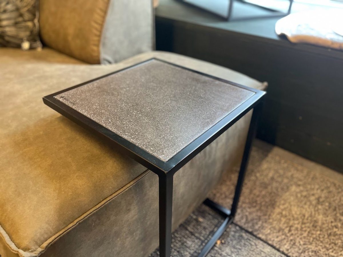 Deze overzettafel heeft een subtiel frame. Gemaakt van zwart metaal. Het blad is gemaakt van Bazalt en is mooi verwerkt in het frame.