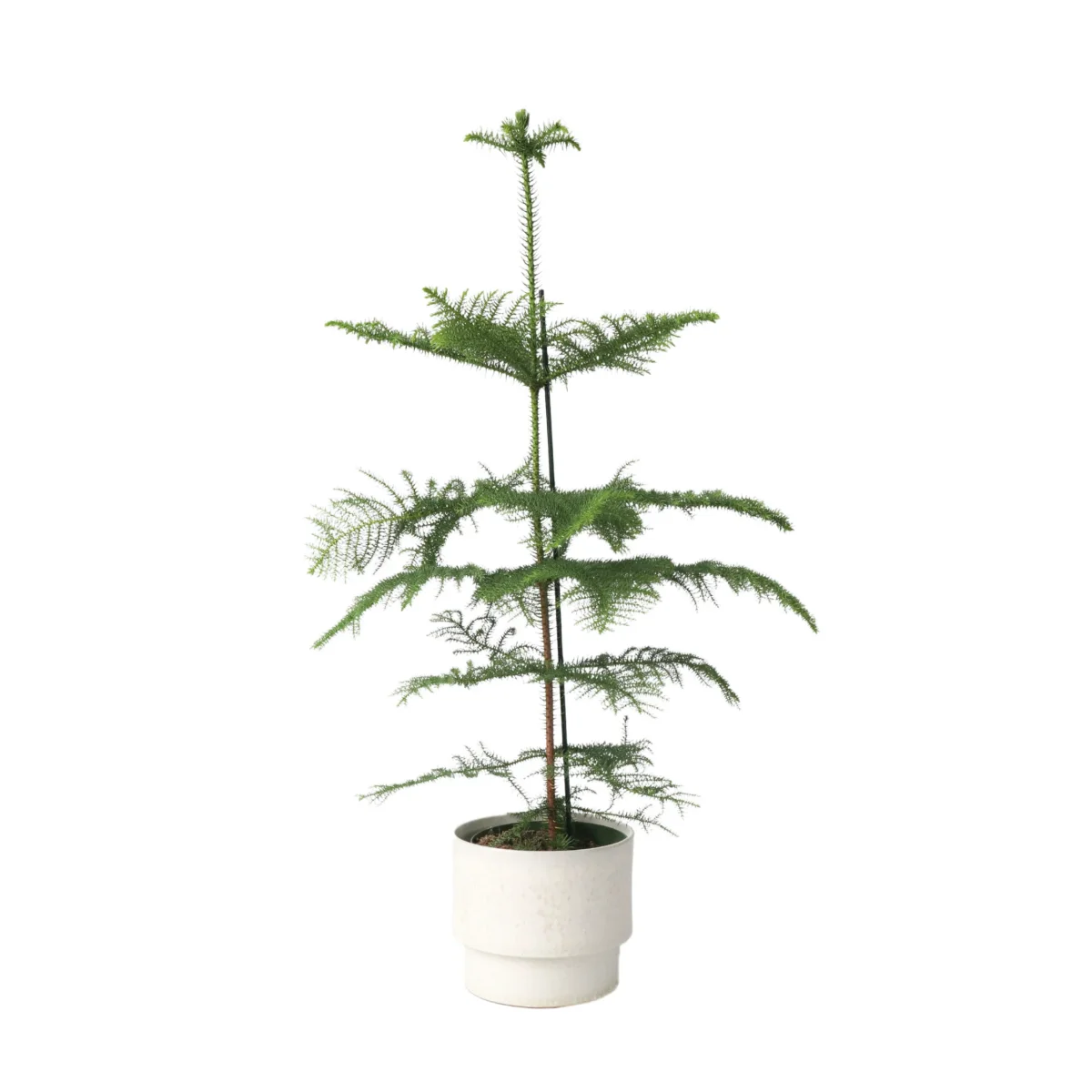 Met de Araucaria Heterophylla, ook wel bekend als kamerden, haal je een prachtige oerboom in huis die je woonkamer een frisse, natuurlijke uitstraling geeft. De Araucaria komt oorspronkelijk uit Norfolk Island, een tropisch eiland bij Australië, en is één van de oudste nog levende plantensoorten op aarde. Hij wordt ook wel de Norfolk Island Pine genoemd. Hij lijkt sterk op een den, maar is het eigenlijk niet. Met een paar lampjes en versiering kan hij zo door voor een kerstboom. Na kerst hoef je de plant echter niet weg te gooien, hij verliest zijn blad namelijk niet. Dit maakt hem een duurzaam alternatief voor de kerstboom. De kamerden staat het hele jaar mooi in de woonkamer en met de juiste verzorging kun je elk jaar van een steeds groter wordende kamerplant èn kerstboom genieten!