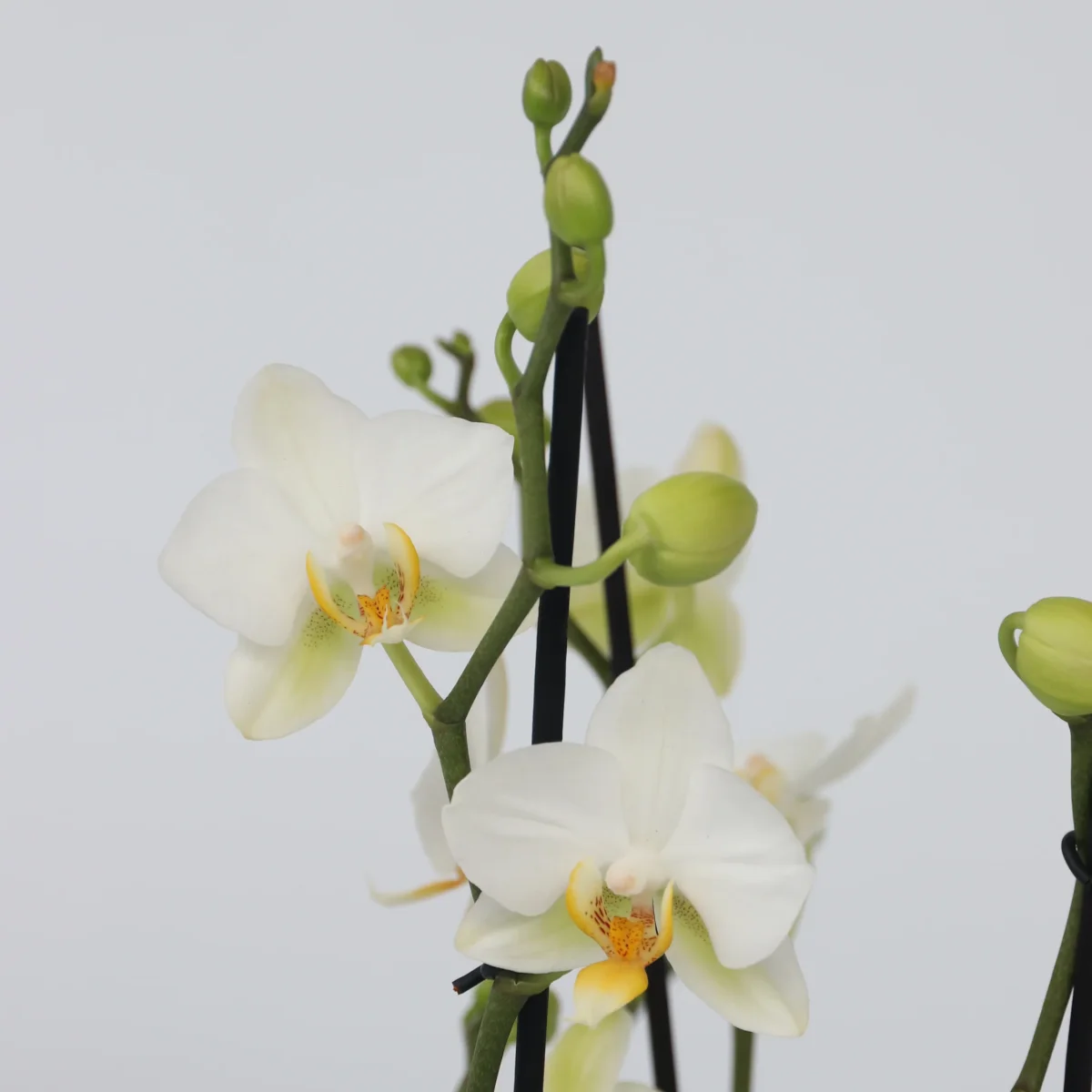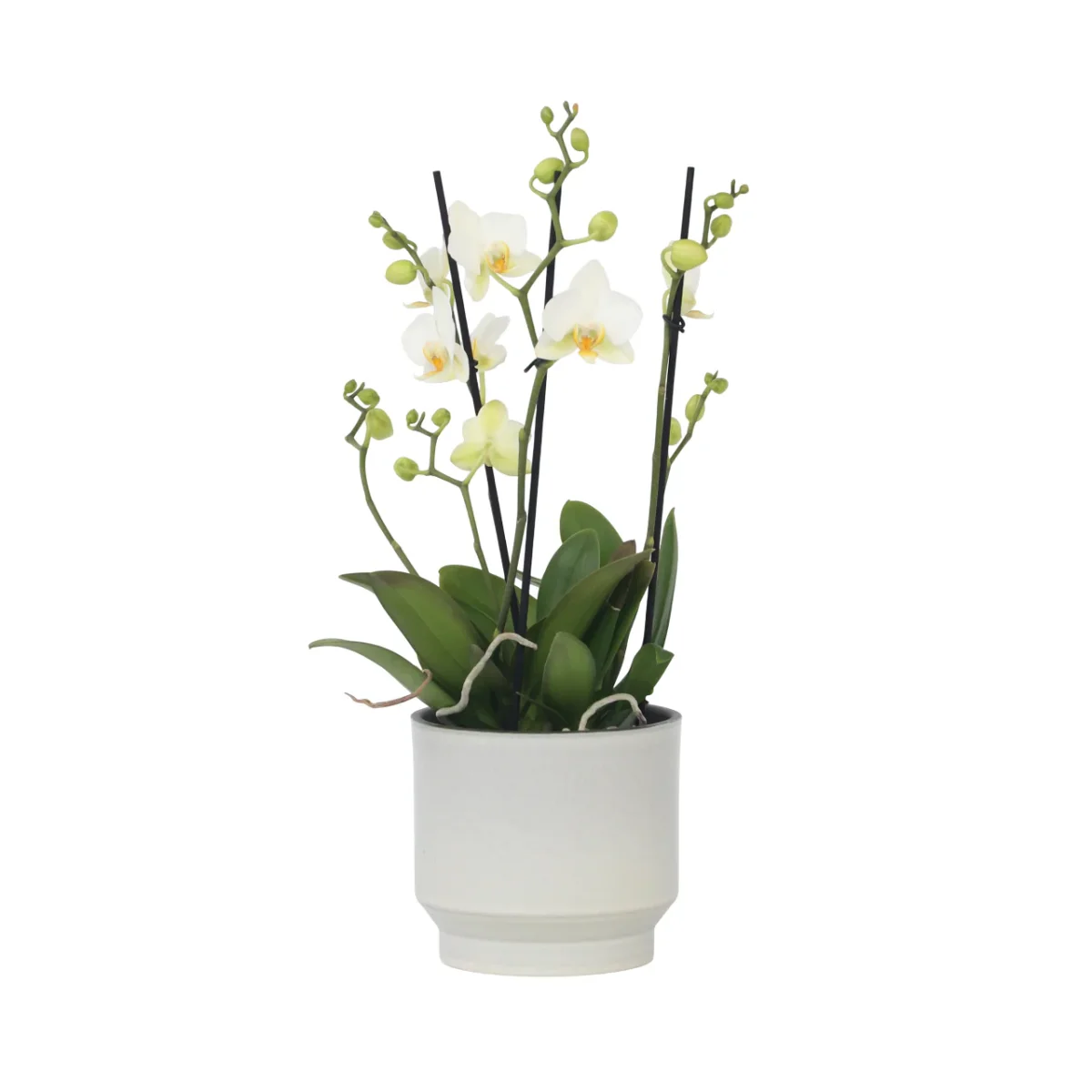 De Phalaenopsis, ook wel bekend als maanorchidee of vlinderorchidee, komt oorspronkelijk uit de tropische regenwouden van Zuidoost Azië, de Filipijnen en Australië, waar zij voornamelijk in bomen groeit. De vlinderorchidee is ontzettend populair en het is niet moeilijk te begrijpen waarom. De orchidee geeft niet alleen elegante bloemen in mooie kleuren, ze is ook nog eens makkelijk te verzorgen en heeft een lange bloeiduur die tot wel drie maanden kan duren. Ook is de Phalaenopsis een van de weinige soorten die meerdere bloemtakken per jaar geeft. De Phalaenopsis Multiflora Wit geeft mooie witte bloemen op 3 bloemtakken.