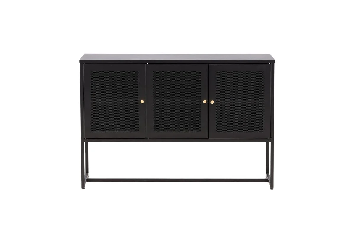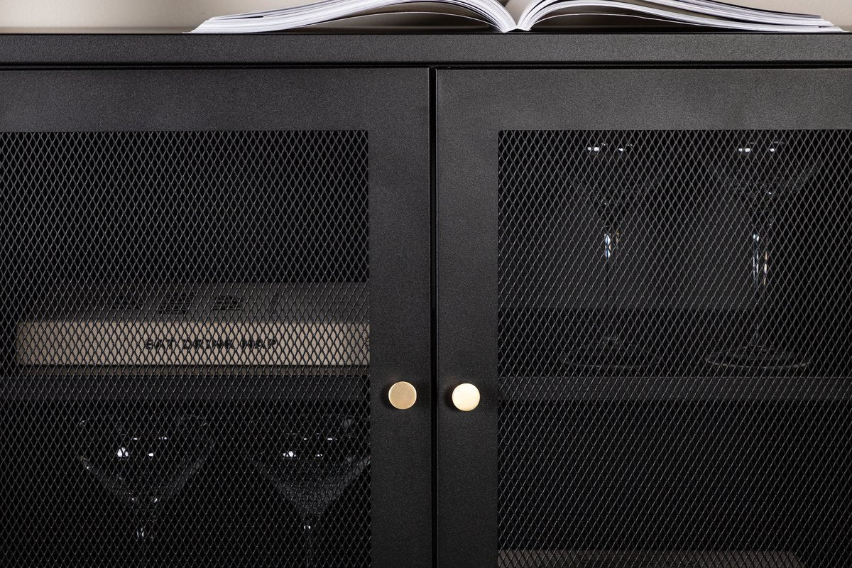 Het Tiberio dressoir in zwart brengt een stoer industrieel design naar je interieur. Met zijn mesh-deuren en slanke, hoge poten van zwart gepoedercoat staal straalt dit dressoir moderniteit en robuustheid uit. De verhoogde poten zorgen niet alleen voor een luchtige uitstraling, maar maken schoonmaken eronder ook eenvoudig.