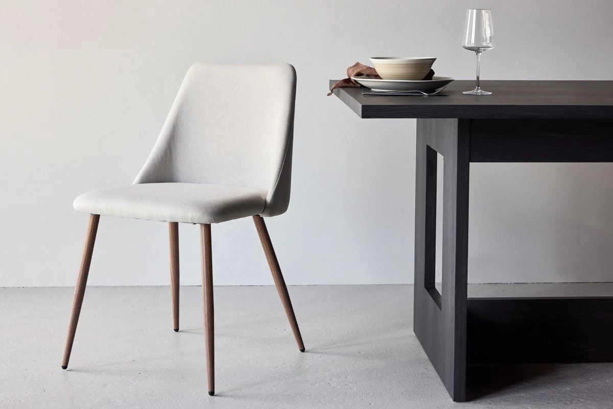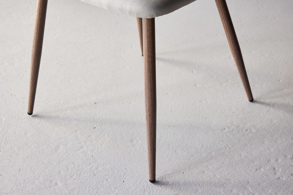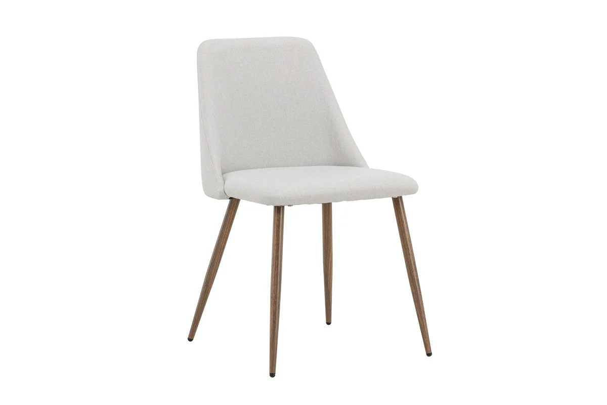Minimalistisch van vorm, maximaal in comfort, de Kangasala eetkamerstoel bewijst dat ingetogen ook indrukwekkend kan zijn. Met haar zachte witte linnenlook bekleding en elegante, slanke poten met houtprint straalt deze stoel pure rust en verfijning uit.