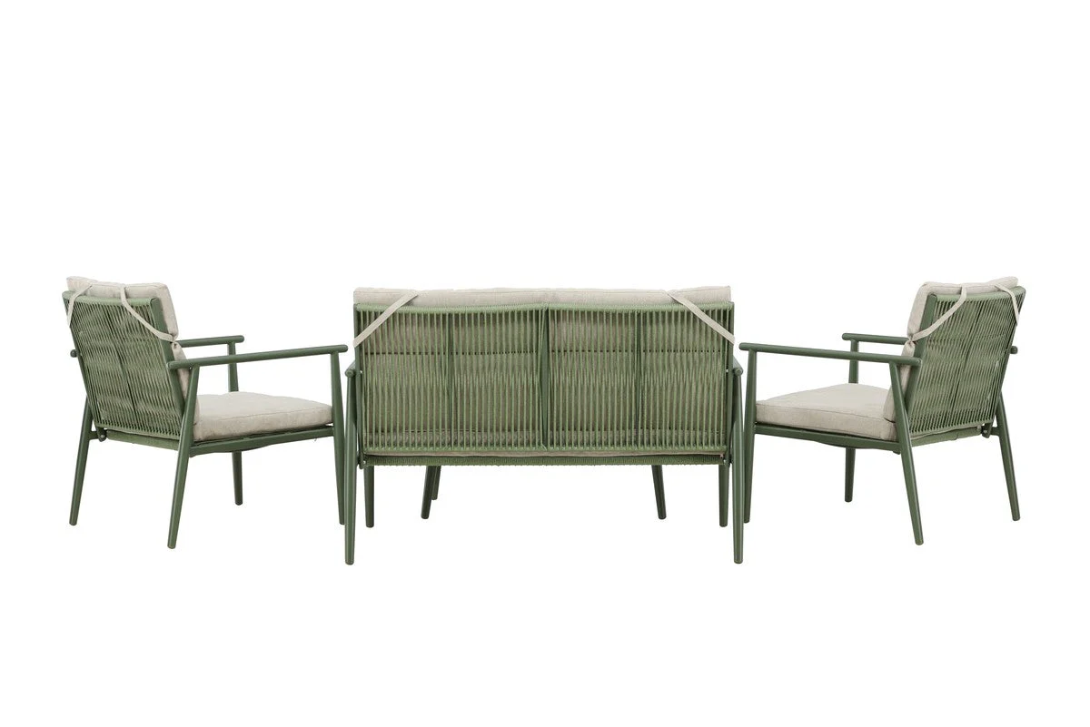 De Kotor loungeset brengt stijl en comfort samen voor een harmonieuze buitenomgeving. Het opvallende groene stalen frame maakt van deze set een echte blikvanger op je patio, terwijl het lichte en luchtige ontwerp een ontspannen sfeer uitstraalt. De set bestaat uit een sofa, twee comfortabele armstoelen en een klein rechthoekig tafeltje, alles wat je nodig hebt om de perfecte ruimte te creëren voor het genieten van het buitenleven met vrienden en familie.