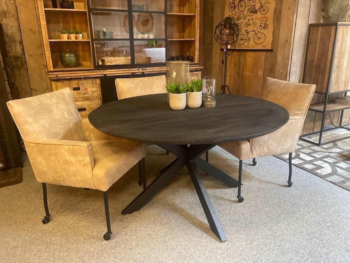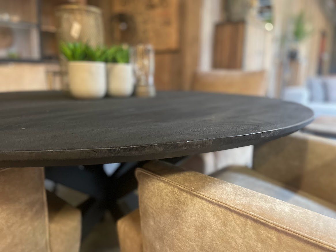 Ronde eettafel New York van Starfurn is een stoere tafel op een zwart metalen spin poot. Het blad is gemaakt van dik zwart afgelakt mangohout dat gezandstraald is waardoor het een robuuste uitstraling heeft. Het blad loopt tevens schuin af, dit noemen we verjongd. Hierdoor heeft de hele tafel een industriële en toch luchtige uitstraling.