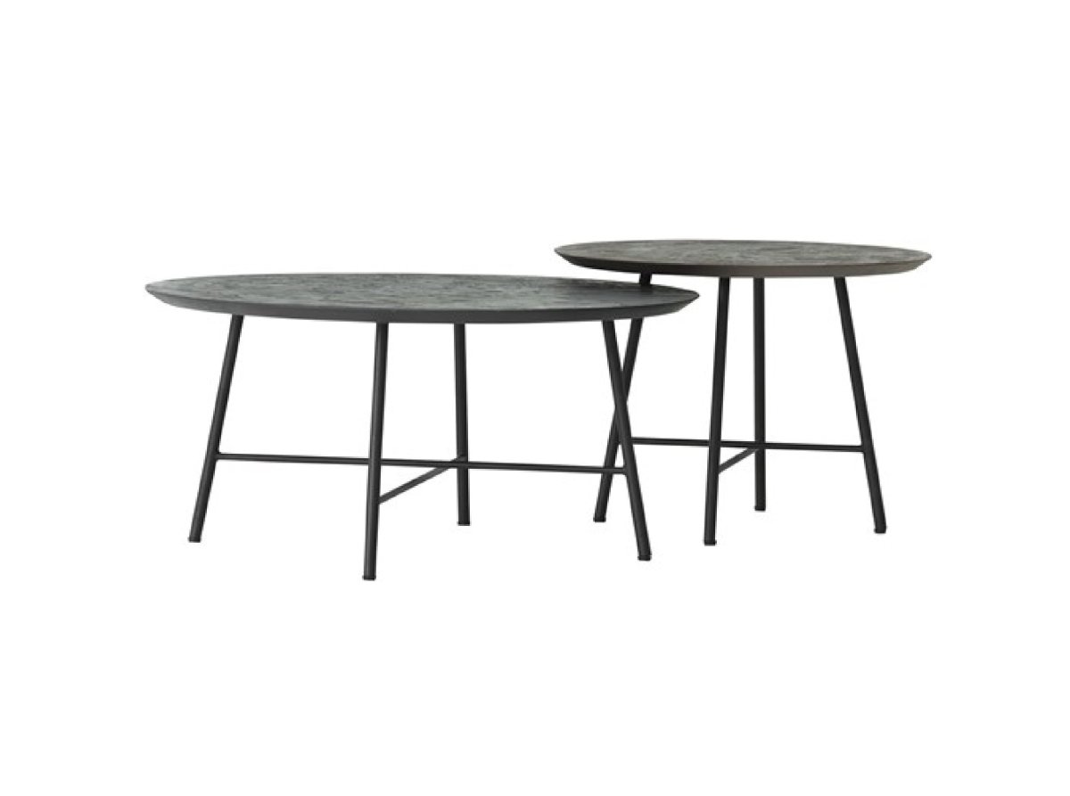Salontafel Scala Delta Earth is een set van 2 gemaakt van mortex, de tafels hebben een ronde vorm en een speels onderstel en zijn makkelijk onder elkaar te schuiven.