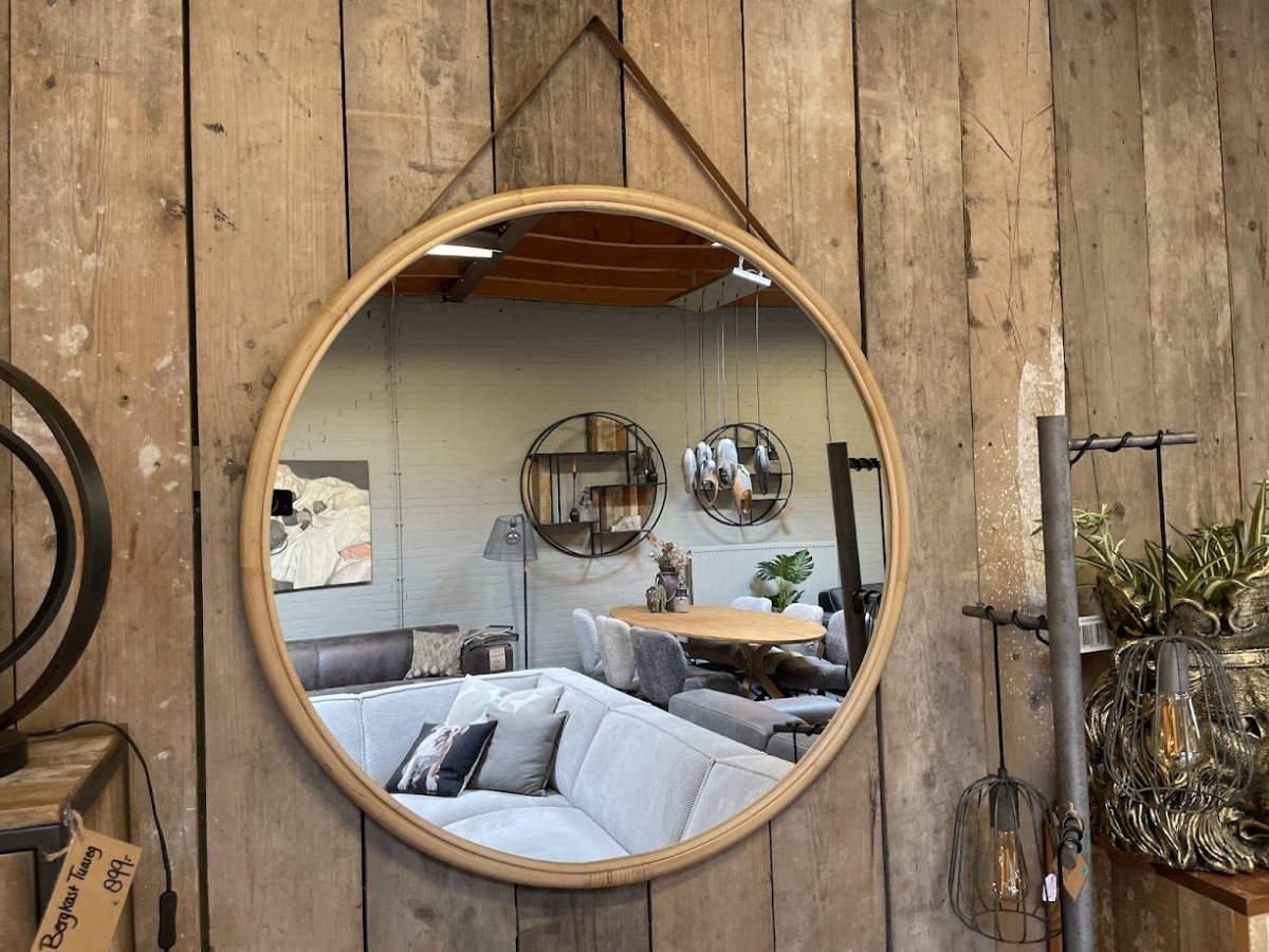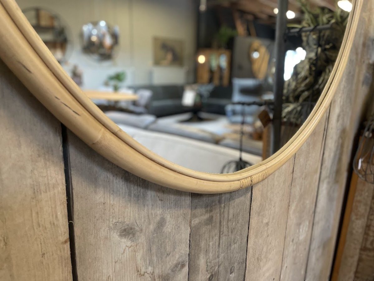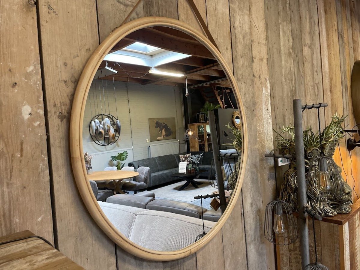 Een mooie spiegel gemaakt van bamboe. Dit geeft hem een stijlvolle en bijna oosterse uitstraling. Deze hangt aan een mooie lederen riem en komt helemaal goed tot zijn recht aan een mooie haak.