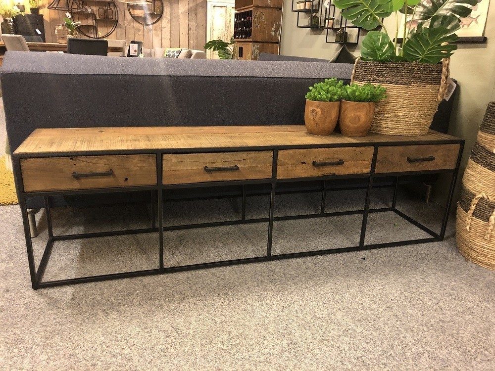 Tv meubel Bruut is een stoer meubel gemaakt van oud, gerecycled hardhout. Deze staat op een open, maar stoer, metalen frame.