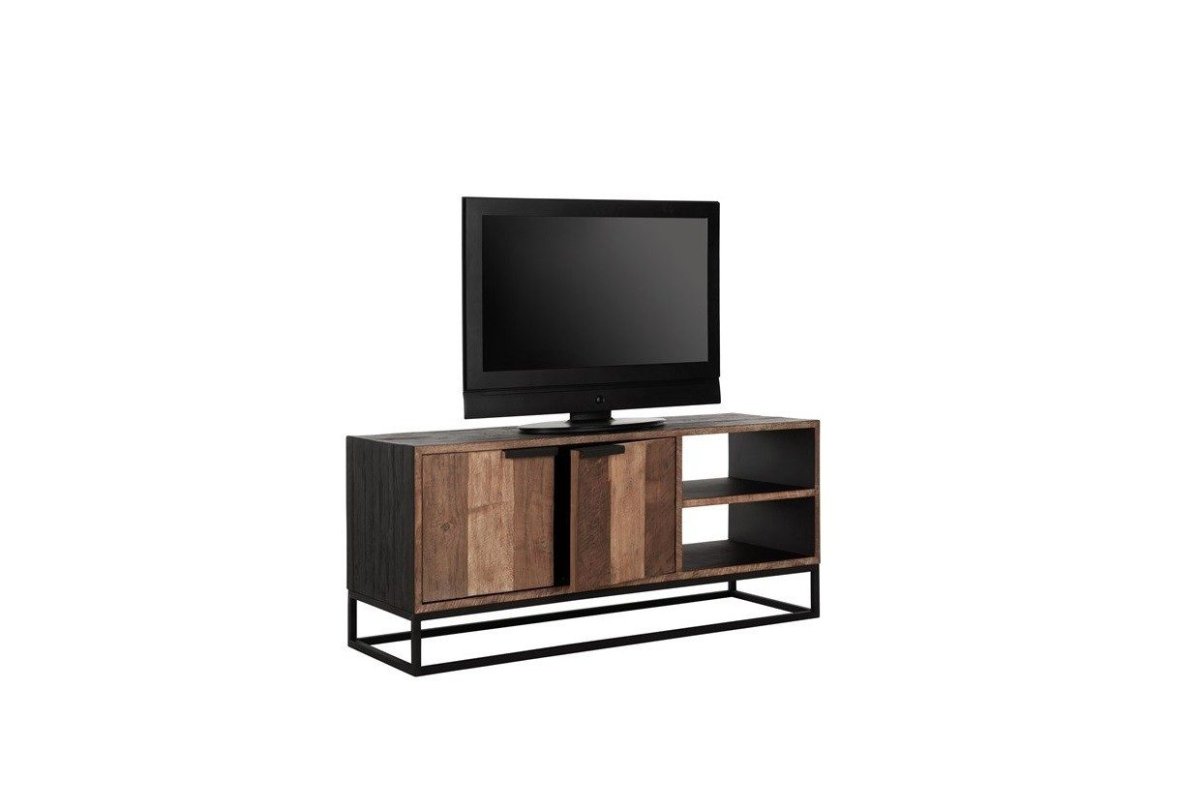 TV meubel Cosmo No.2 combineert naturel en zwart teakhout en is hiermee een opvallende verschijning. Deze tv meubelen hebben altijd één open vak gecombineerd met minimaal twee deurtjes. Dit tv meubel staat op een stevig zwart metalen frame wat een open en luchtig effect geeft.