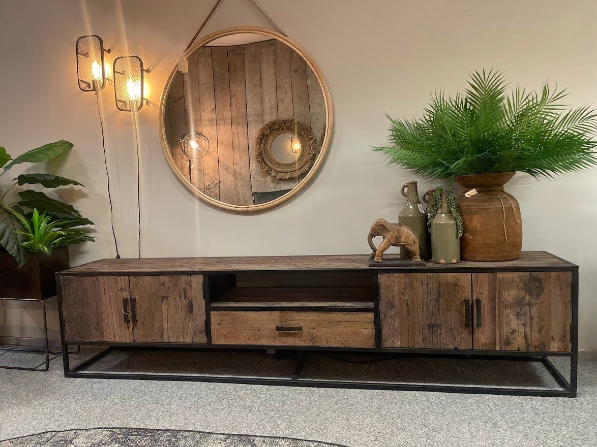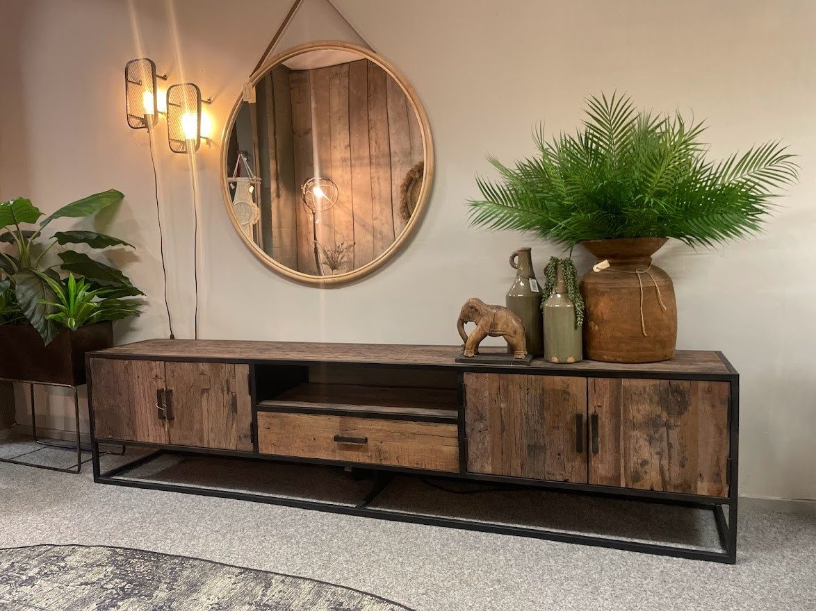 Tv meubel Rough 240 is gemaakt van oud, robuust hardhout met een ruige uitstraling. Deze is afgewerkt met en donker, metalen frame en is voorzien van vier deurtjes, een lade en 1 open vak. Hierdoor is het mogelijk om zowel het apparatuur als andere dingen op te bergen in dit tv meubel.