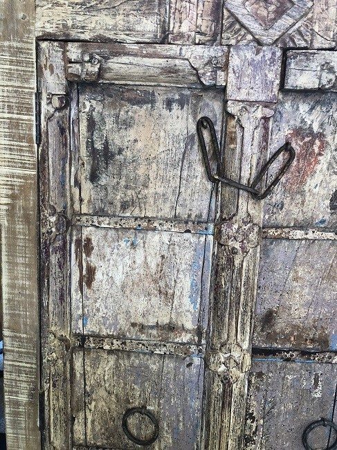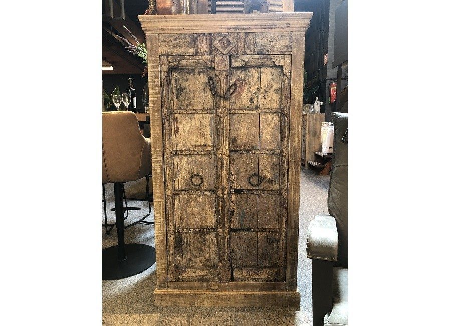 Deze prachtige handgemaakte unieke India kast is, net als alle andere meubelen uit India, uniek. Deze kast is gemaakt van oude teakhouten poortdelen, waar met oud houtsnijwerk en teakhout met veel zorg een unieke kast van gemaakt is.