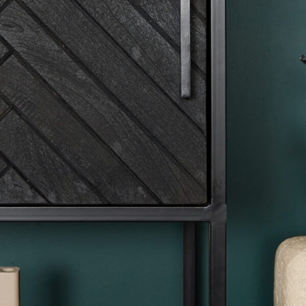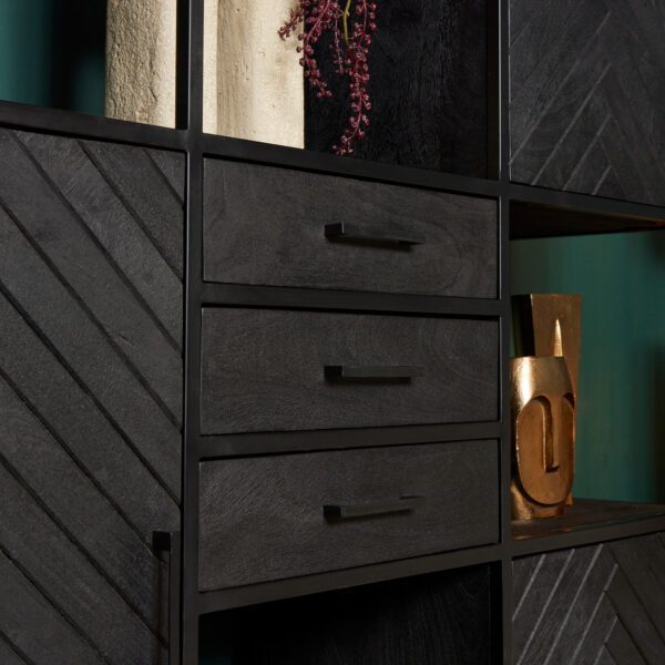 Deze vakkenkast Supreme XXL uit onze ‘New York serie’ van StarFurn heeft drie lades, twee grote deuren en twee kleine deuren, twee legplanken en zes open vakken en wordt uitgevoerd in een visgraatpatroon. Achter de twee grote deuren vind je nog een extra legplank. De vakkenkast is gemaakt van gezandstraald mangohout en is afgewerkt met een zwarte lak. Het frame en de handgrepen zijn gemaakt van metaal en afgewerkt met een zwarte lak.