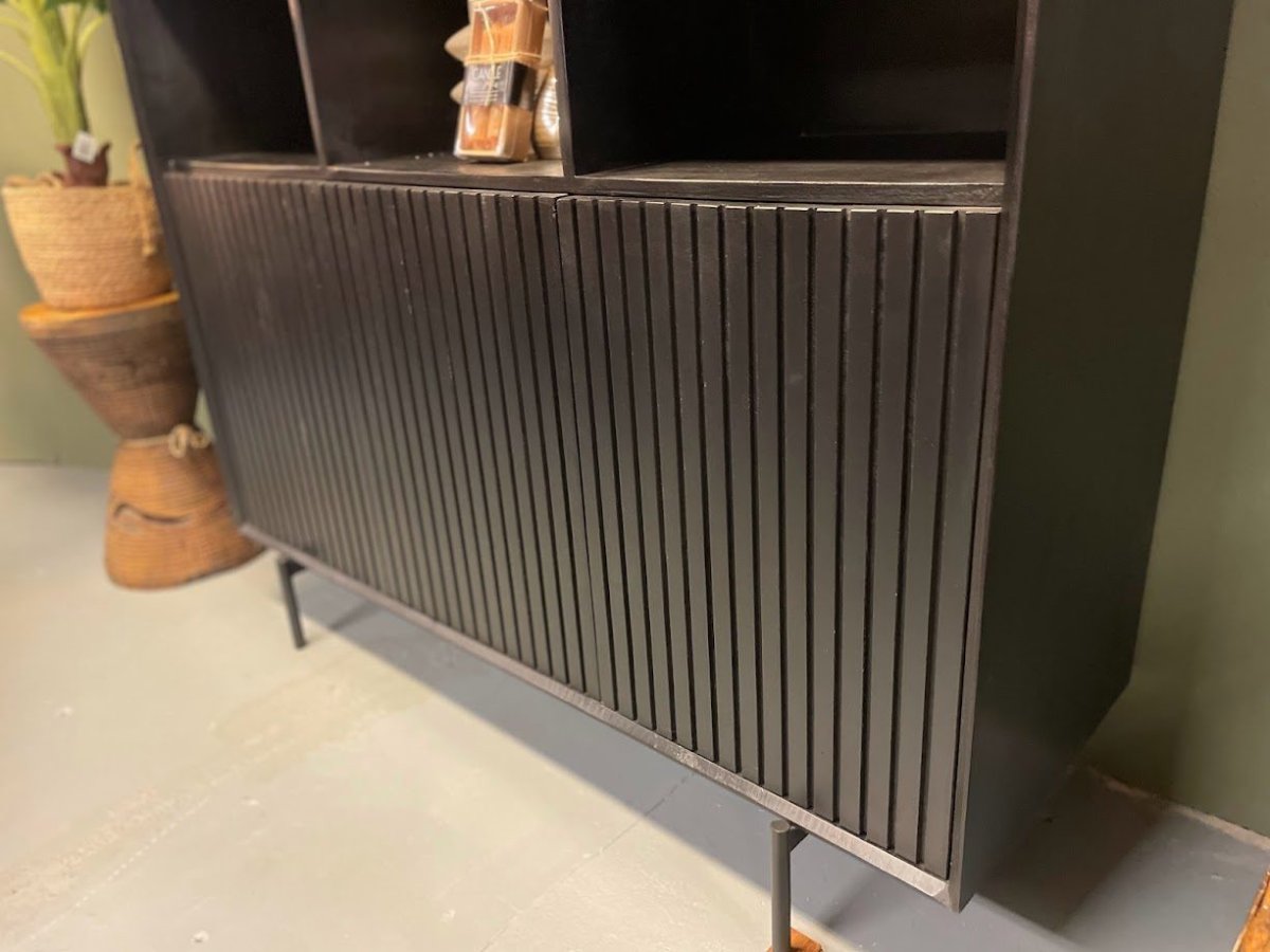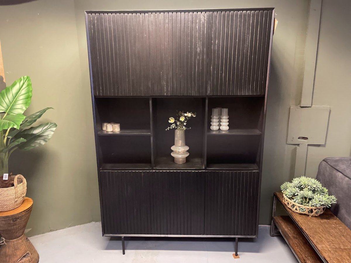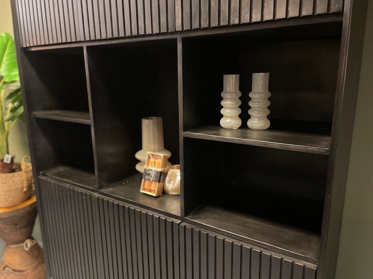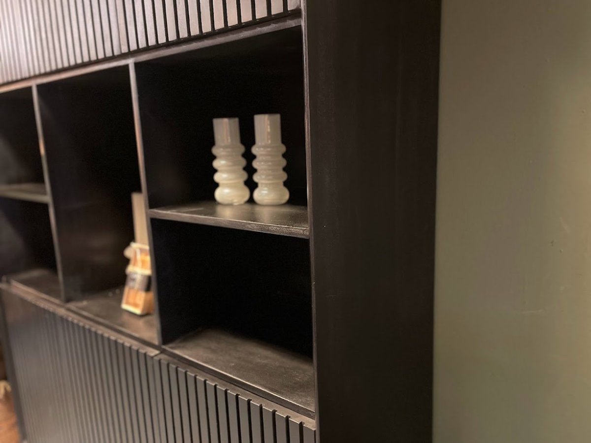 Met zijn zes deuren, elk met een eigentijds verticaal lattenpatroon en dezelfde stijlvolle zwarte afwerking, voegt de vakkenkast XL Madison een vleugje moderniteit toe aan jouw leefruimte. Maar wat het echt bijzonder maakt, is hoe het de ruimte transformeert en een warme, uitnodigende sfeer creëert die perfect is voor gezellige avonden met vrienden en familie.