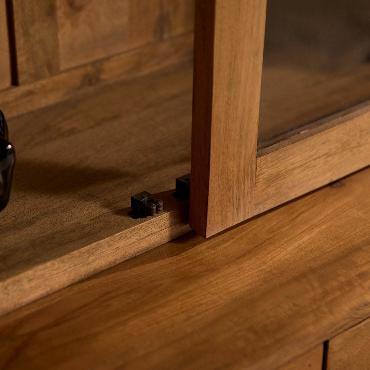 Vitrinekast Boaz 200cm XXL van Starfurn is uitgevoerd in het mangohout. Het metalen frame en de metalen handgrepen zijn afgewerkt met een zwarte lak. Dit model is voorzien van vier lades en acht deuren. Achter de deuren zitten handige legplanken. De vitrinekast is ingelegd met verschillende stroken gelakt hout, waar het meubel zijn eigentijdse karakter aan te danken heeft.