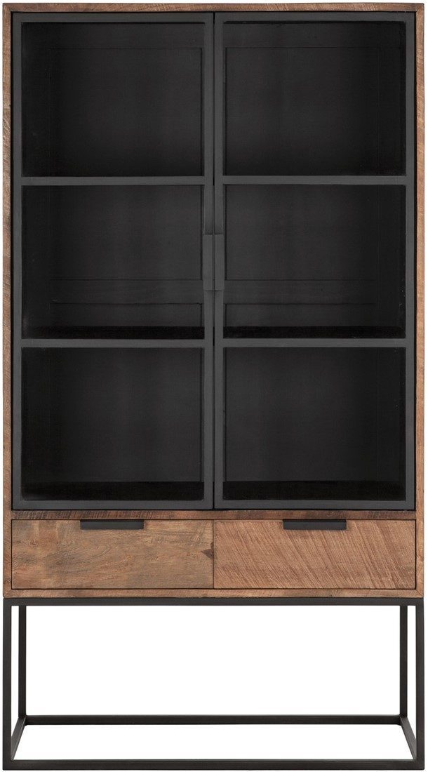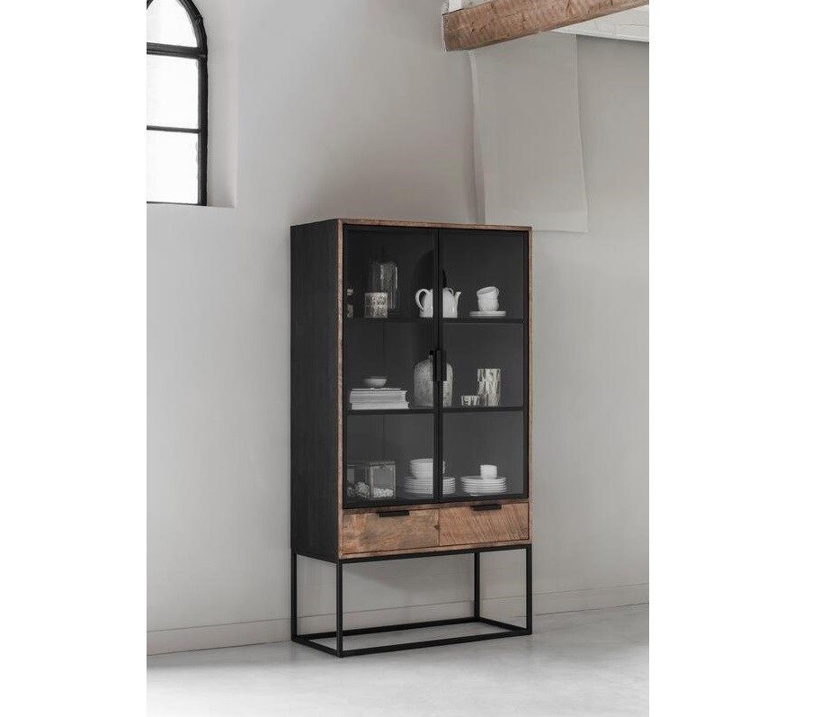 Een prachtige Vitrinekast uit de Cosmo serie. Gemaakt van oud, gerecycled teakhout. Deze staat op een donker, metalen frame. Dit geeft de kast een luchtige look. De vitrinekast heeft 2 glazen deuren met daarachter 2 legplanken. De buiten omlijsting van deze kast is zwart gebeitst, dit geeft het meubel een stoere en toch subtiele uitstraling. Ook is Vitrinekast Cosmo uitgerust met twee laden. Hierdoor zijn er ook nog spullen in deze kast op te bergen die niet direct in het zicht hoeven te staan.