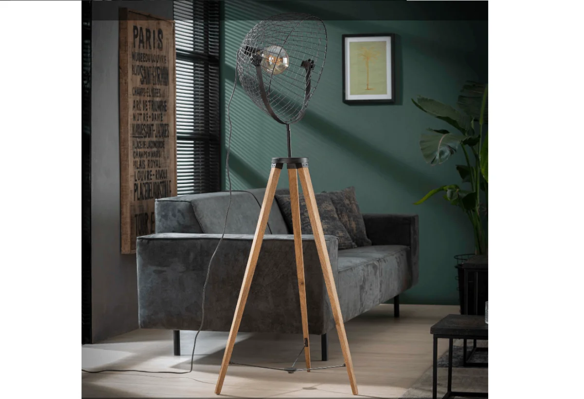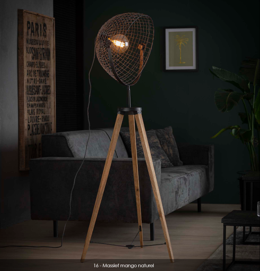 Vloerlamp Spotlight is een stoere en toch subtiele lamp. Deze heeft een mooie draad kap van donker metaal. De poot van de lamp is gemaakt van massief mango hout.