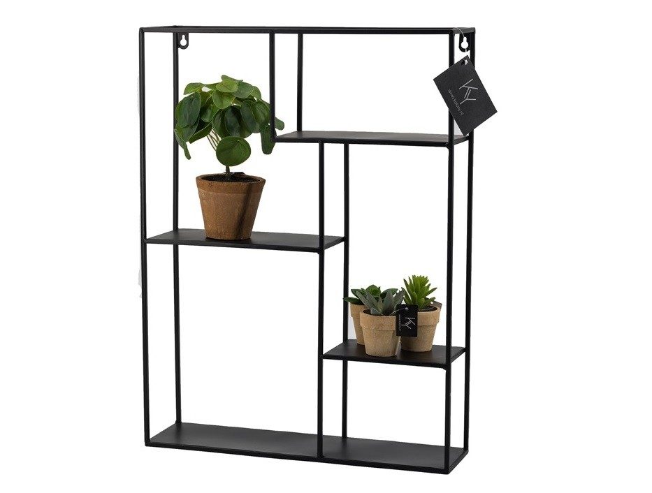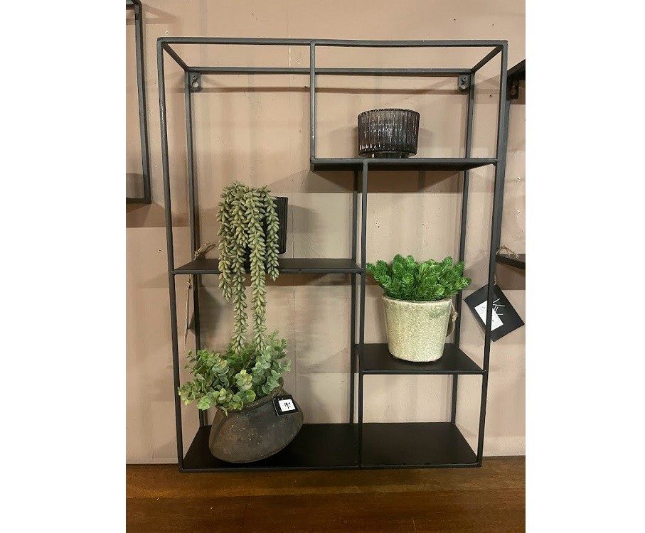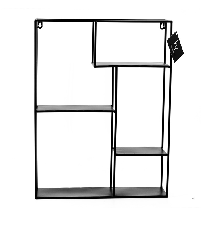 Een leuke en behendig wandrekje. Gemaakt van zwart metaal met speelse verspringende vakken.